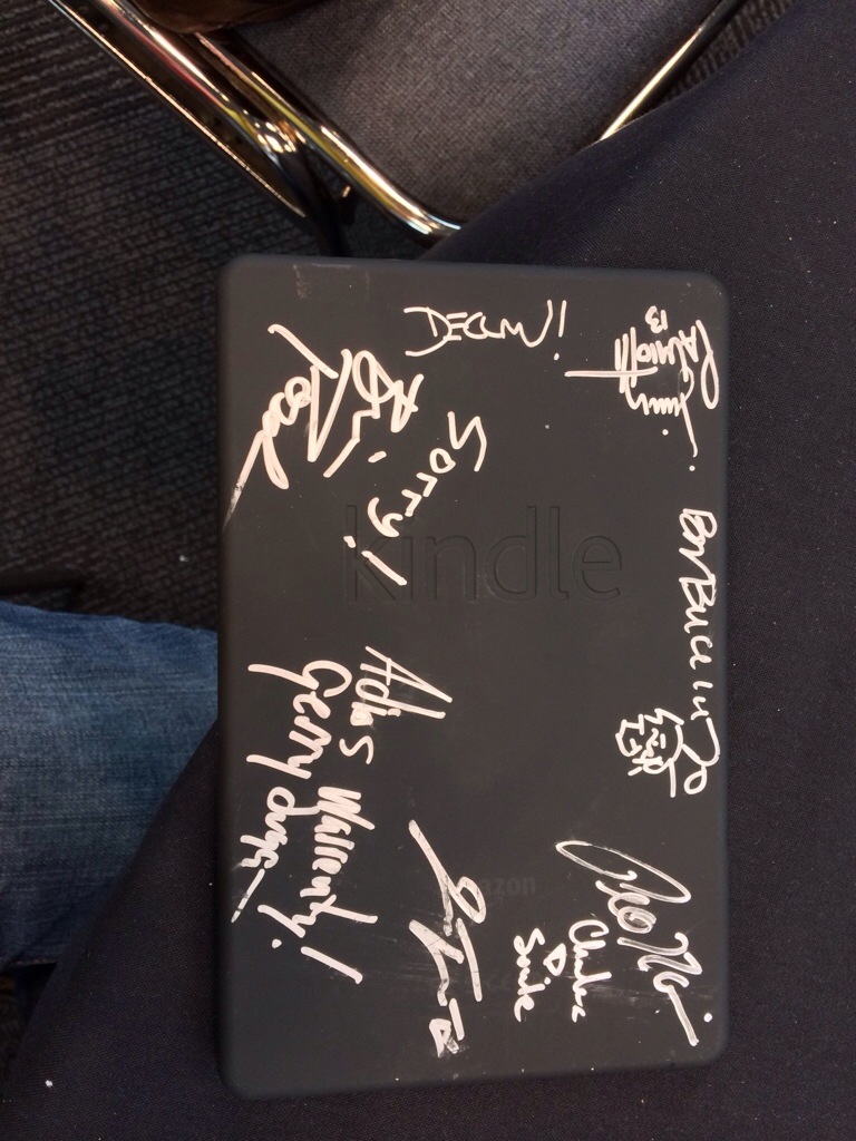 Patrick: Oh, and because I mostly read my comics digitally, I don’t have a lot of relevant floppies for anyone to sign. Luckily, artists and writers are more than happy to take turns ruining my Kindle Fire with a silver Sharpie. Here’s how it looked after our run through the Alley.