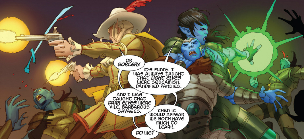 Shelby: I think Aaron is giving us a story that has more depth AND is a bit of comic relief. Sure, there are themes of duty and justice, the nobility of uniting despite your differences for a greater cause, but ultimately this is just madcap team fun. I mean, we’ve got a silent giant, a dwarf demolitions expert, and a foppish elvish sharpshooter: just typing those words was a good time. Honestly, if I could change my name to Shelby Honeyshot, I would; I love that dandy of an elf.