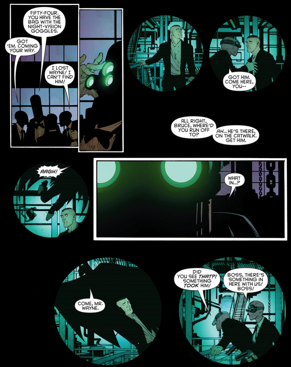 Bruce leads TV crews, and the cops, to the chemical plant where the Red Hood Gang is operating. The gang causes enough of a distraction to allow Bruce entry into the plant, where he enacts his own plan- with Alfred’s help. They shut off the power at the plant, and in the darkness Bruce becomes Batman. But they’ve fiddled with the Gang’s night-vision goggles to make it look as if Batman saves Bruce.