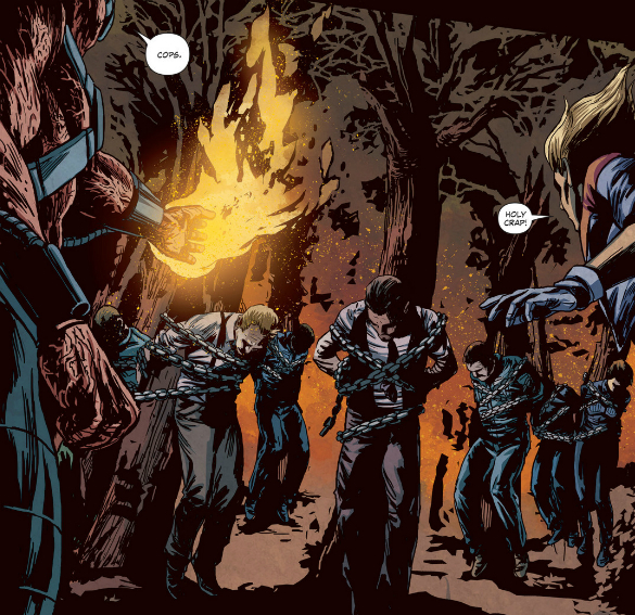 Quick mention: Drew, I know you already mentioned the art, but I can’t help to bring up how great Zircher’s work is in this issue. The Central city skyline shot and the cops tied to trees shots gave me chills and cemented for me how awful things on Earth are going. Great stuff.