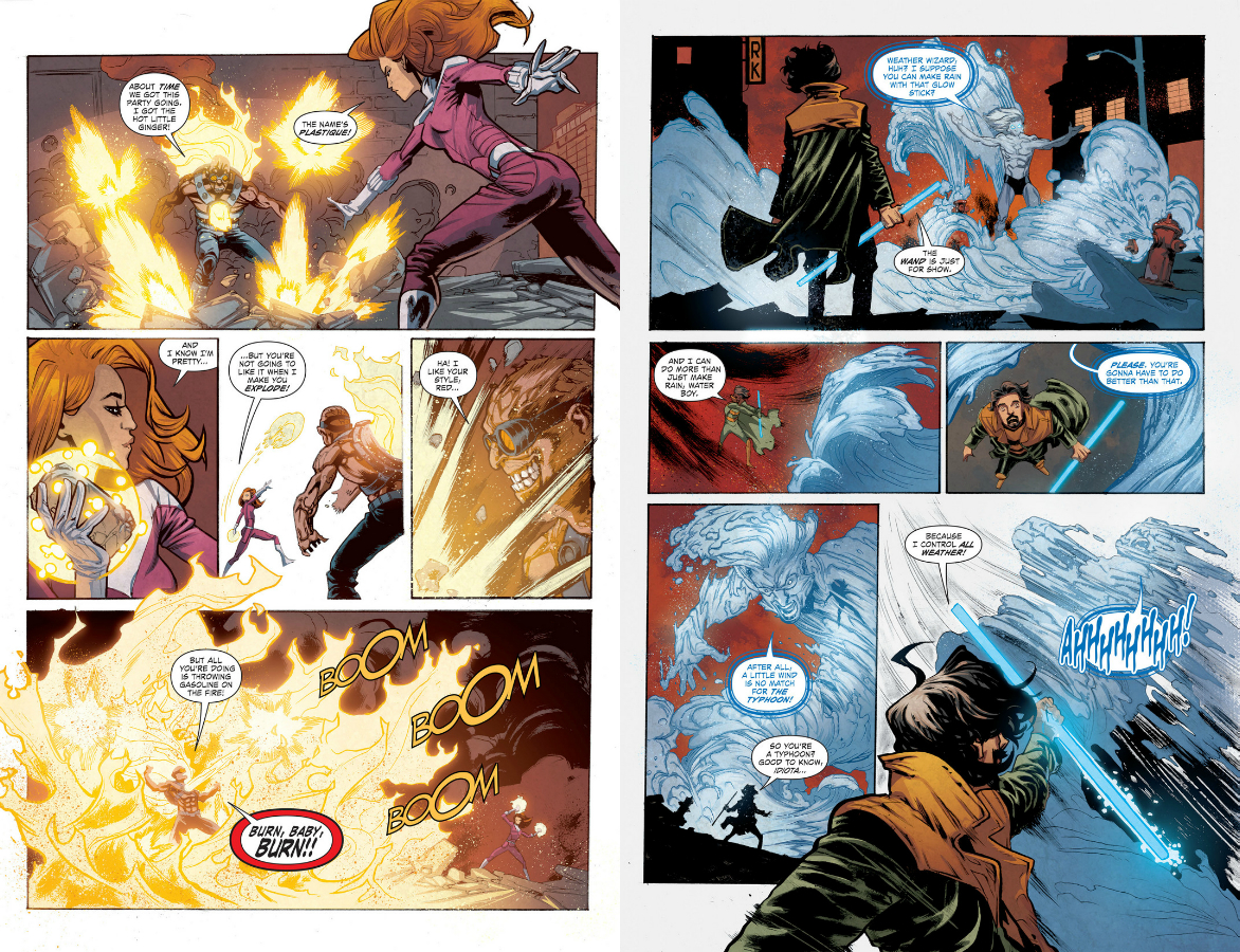More problematic, though, is that I’d have a hard time individually describing the Rogues if I couldn’t mention their powers or appearance. You could probably swap lines between them and never know the difference. Not to mention this lack of strongly defined character leads to more fundamental problems, like: what exactly causes these men to stand against the Syndicate? The Rogues are upfront about their disinterest in world domination, but disinterest doesn’t strike me as a strong enough motivation to defy the people that killed the Justice League. What is it about the Rogues that makes them not just adverse to world domination, but hostile towards it? I understand that Captain Cold and Mirror Master want to keep Glider alive, but the Syndicate welcomed them into their organization, and as far as I’m aware there wasn’t a stipulation banning villains in recovery. I doubt the Syndicate wouldn’t have let them move her. There isn’t anything in this issue that defines for me what their motivation is, and I could take a guess, but it’d be speculation and it‘d be biased because I’ve read Final Crisis: Rogues Revenge. Interestingly enough, many of these character issues weren’t apparent to me until my second reading. I did a lot of assuming about the characters based on other material, and I can only wonder if that was a shared fault between Buccalleto and myself. It’s understandable, but it’s lazy writing to rely on the Rogues’ Pre-Flashpoint mythos to do the work for you (especially since they’re so keen to over explain other things.)