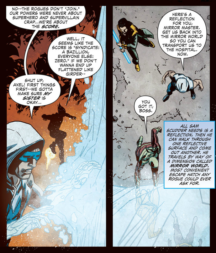 The big thing for me is that the Syndicate aren’t street thugs, and this isn’t a mugging — they’re imposing a new world order. Even if the Rogues submit, they don’t get to “walk away.” I don’t want to get too highfaluting about this, but the uprising in the Warsaw ghetto demonstrates that it’s simply part of human nature to fight back under these circumstances. Mortal, non-superpowered people can do it, so I totally believe that the Rogues could, too.