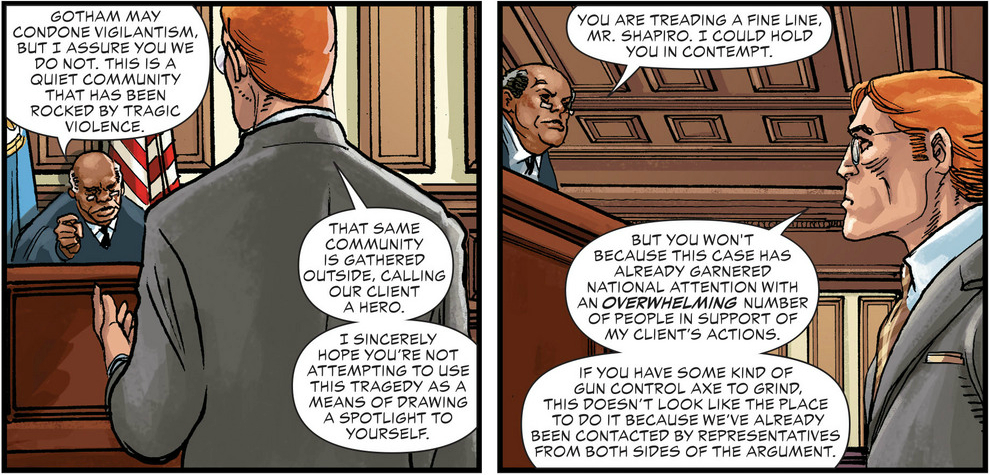 I had lost a bit of interest in this title when Hex showed up in the modern day — something about the humor of the fish-out-of-water thing didn’t jibe with the character for me — but writers Jimmy Palmiotti and Justin Gray find the through-line for a modern-day cowboy in this issue. Having not read the whole of this arc — where Hex was both persecuted and prosecuted for his vigilante ways — I can’t speak with any authority on what Palmiotti and Gray might be saying about city vs. country or east coast vs. out west, but those contrasts seem important for Hex’s success in this issue. There are passing mentions of gun control in the courtroom scene, but are addressed so vaguely as to be completely toothless.