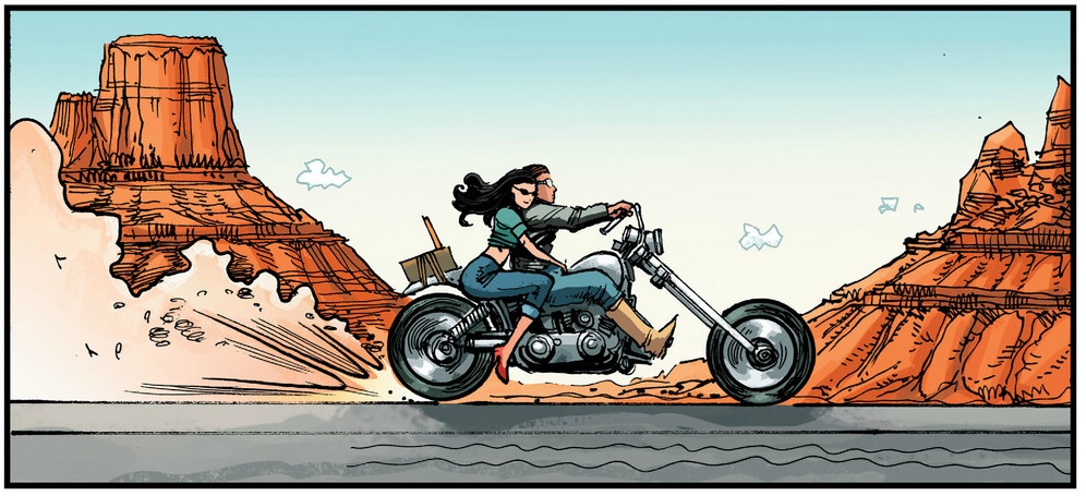This West, as it is portrayed in All-Star Western, is what I found most interesting in this issue. We can’t help but compare this modern West with the Old West that Jonah left behind before his time travellin’ days. In some ways the west is the same and in some ways it’s different, however, the constant is that Jonah is equally at home in both. This is exemplified by the ease of which he is able to not only meet a travelling companion, but also his sudden ability to manage a new kind of steed.