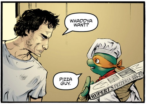 In the beginning of the issue, writer Kevin Eastman and scripters Tom Waltz and Bobby Curnow do a great job of positioning the many pieces of the City Fall story on the eve of battle. First, we see Michelangelo, disguised in a pizza outfit (an obvious attempt to appease Patrick’s lust for seeing Mikey in cute hats) finding out where the Foot Clan is planning to hold its regional meeting.