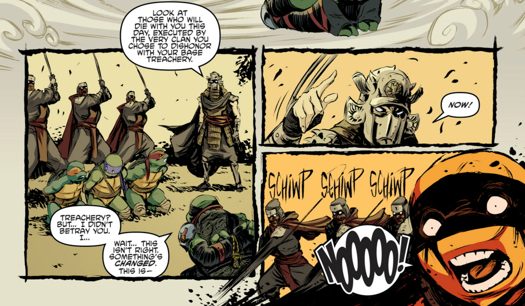 I love the way Leo’s fantasy dream execution looks and sounds just like the execution of the Savate leader. “Schiwp” is such a specific sound effect, and it draws an obvious line between Shredder’s tyranny centuries ago and what he’s doing today.