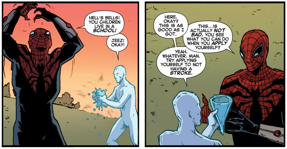 This schooling by Spider-Man opens itself up to humor when, frequently, the X-Men are either incapable or unwilling to perform the feats he tasks them with. When trying to defeat the prototype of the Abomination robot, Spider-Man asks Ice Man to make a cone which he can use to knock out the mechano-man’s power source. In doing so, he gives a list of incredibly detailed instructions to Ice Man who, naturally, finds them confusing. Spider-Man’s reaction to this is entertaining.
