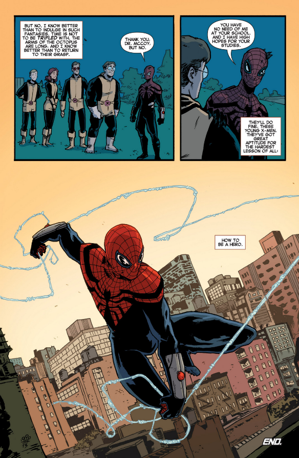 The suggestion at the end of the issue that, with the right nudge, DocOck could have been an Avenger is fascinating to me. Otto’s attitude is still insufferable, and he seems to always be motivated by personal insults, but he’s without a doubt heroic in this issue (and even respects the budding heroism in the young X-Men), suggesting that he maybe could be an Avenger. Of course, Carlie’s actions over in Superior Spider-Man may bring that to a pretty quick end.