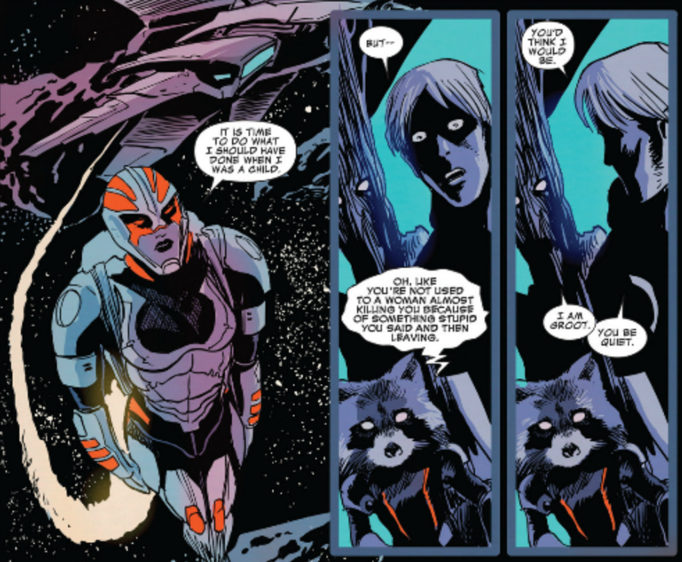 In terms of plot developments, this issue is relatively light. The concerns over the tears in space-time, which have occupied Quill in recent issues, are basically ignored. We get a break from all the confusing stuff by way of a pretty straightforward mission. The big conflict among the Guardians centers around Gamora’s frustrations with Quill having visited her father, Thanos. Oddly, she mostly seems upset that they didn’t kill each other during the meeting. She has absolutely no trust in her father, and just thinking about him drives her mad, until she simply floats off into space, not to be seen again.