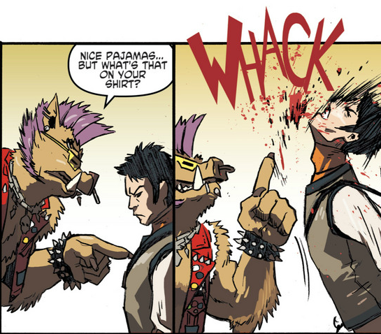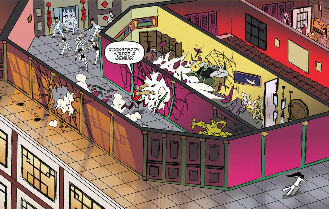 Our reintroduction to the duo begins back when they’re still human low-lifes being kicked out of the last gang in town. Since no one else will have them, they jump at the chance to join Shredder’s army and fight their way through a Battle Royale initiation brawl to win their now familiar warthog and rhinoceros mutations. Before they’re officially deemed worthy to be soldiers of the clan, they accompany Karai to a meeting with Xiang Fei Tong, leader of the triad Ghost Boys gang. In their typical fashion, Bebop and Rocksteady joke around and end up killing a squad of Tong’s guards, ruining the meeting and sparking an all-out firefight between the two groups. The fight brings down the entire building, summons the police, and puts the two thugs squarely in the doghouse with Karai. They use their newfound mutant durability and strength todefeat her team of assassins and surprise her by telling her that even though she just tried to kill them, all they want is to be part of the Foot Clan. She agrees, warning them that they owe their lives to the Foot.