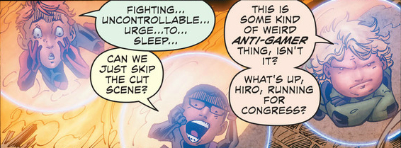 This issue may be too meta for me to parse entirely (and if I’m saying it, you know it must be true), but the things that really intrigued me here were the other gamers Hiro brings in to fight Batman. It would have made sense for them to each get their own avatar, but instead, they all work together to impersonate Nightwing. It’s an interesting commentary on the collaborative nature of creating comic books, and writer Greg Pak gets in some sly digs by having one of the collaborators — the only one devoted enough to be wearing a Batman AND Superman shirt — effectively go rogue.
