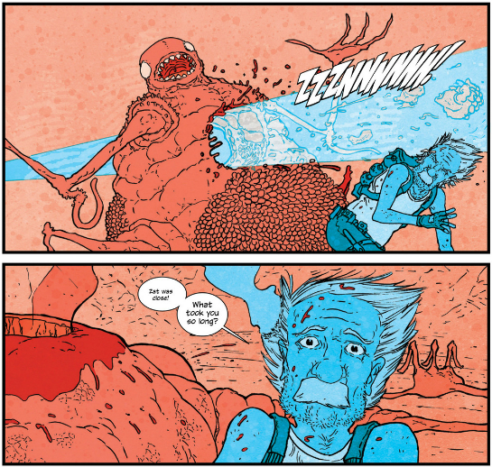 That being said, the real meat of this issue comes not in the scenes that take place in the present, but the past. Throughout the issue the narrative cuts to Einstein and Feynman out on another of their hunting expeditions to collect alien body parts from places of the universe unknown. While the story of them hunting a semi-hive minded organism is entertaining, the thoughts the two scientists exchange while out killin’ are the most interesting part of the story. In particular, Einstein has some choice observations.