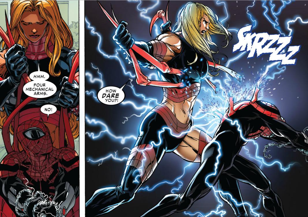 First, my heart broke a little for Angelina in this panel. Yes, she’s a murderous criminal, but she just looks so pitiful. She just got back the man she loved, the man she thought was dead (again), only for him to dump her. Now I don’t expect our new, more heroic Otto to date a criminal, and the way he broke up with her is pretty gentle all things considered, but did Spider-Man ever even catch her? Angelina is heartbroken, probably mentally ill, and now fending for herself; without her VR she may be no danger to the public, but I’m worried that she’ll be a danger to herself. I’m worried that Otto has let this lost soul become a little more lost.