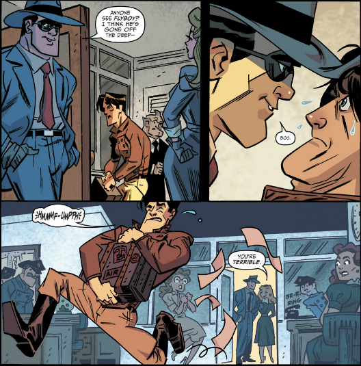After such a heavy diet of straight-up hero comics with ridiculous superpowers and machines, it was equal parts disorienting and refreshing to read about characters that are a little more earthly, regardless of the zany devices introduced in this issue. The best example of that is in Spirit’s self-introduction to the Rocketeer: