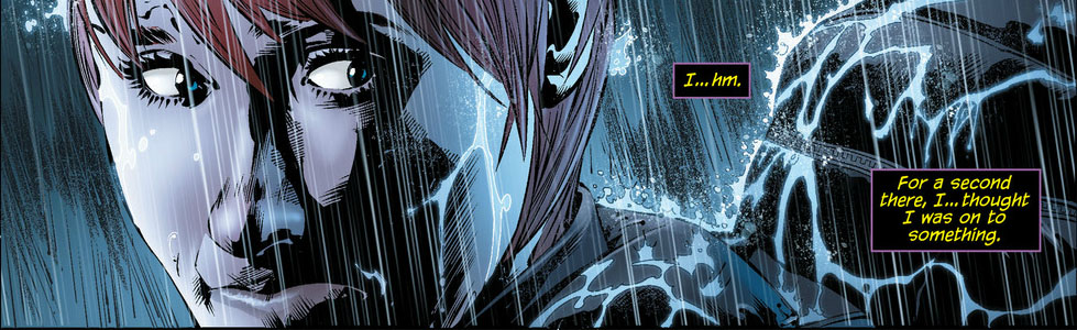 Absolutely agreed. I had such a hard time choosing what image to post when I mentioned how well Pasarin conveyed the misery of this storm, because there were so many good options–the island exploding, buildings caving in, all this beautiful rain and landscape. Eventually I chose the one I did because we could see how miserable the people are in it, but regardless, he absolutely aced Zero Year Gotham; but those faces…man, those faces.