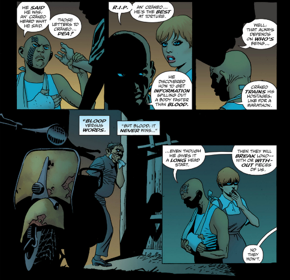 I often remark on the cleverness of Azzarello’s dialogue, but he’s also capable of some incredible eloquence. Sure, Paulo is describing some truly horrifying concepts, but the thought of torture as a race between blood and words has a kind of perverse beauty to it.