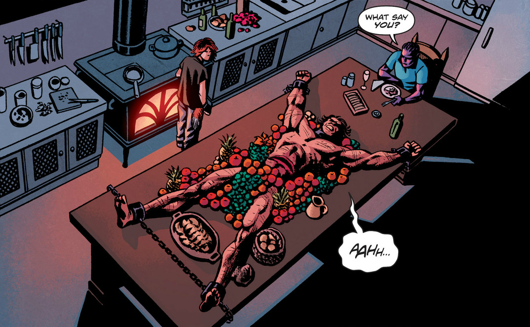 It’s dark stuff, but it’s also an appropriately mythological method of revenge. Interestingly, the ancient Greeks believed the liver to be the seat of human emotions, so Prometheus’ punishment for having too much compassion is that he lost it each day. Here, Apollo is eating the First Born’s spleen, an organ which is all-but vital — indeed, you can live quite comfortably without it — emphasizing the fact that the First Born’s primary crime is simply existing.