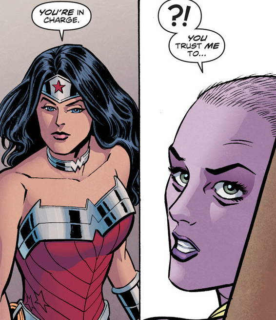 Sure, Strife is about as trustworthy as Loki on a bad day, but iconography doesn’t lie right? That “?!” above Strife’s head tells me that even she didn’t see this particular development coming. Here, we see Diana, inspirational embodiment that she is, placing a sacred trust onto Strife. She is asking Strife to return the trust that has been given to her. In essence, I believe that Wonder Woman is trying to inspire Strife into goodness, and perhaps even selflessness.