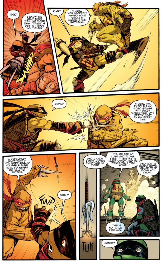 What’s most interesting about this being the end of the City Fall arc is that so much is left undone. The most obvious evidence of this is that Leonardo clearly isn’t completely rid of the brainwashing he underwent while in Shredder’s hands. Throughout the issue he’s groggy, doesn’t appear to really know where he is, and at one point even attempts to attack Splinter (yet again).