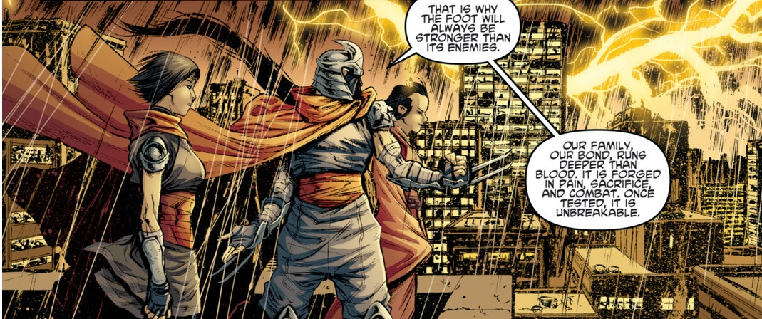 This issue was packed to the gills with action, and while the conclusion puts all of the pieces back where they belong (as well as introducing a few more), this issue is surprisingly light on emotional closure. Indeed, the only arc that really concludes here is Karai’s quest for Shredder’s approval. She has fully earned her place as chunin, and Shredder’s speech about family as something to be earned is proof that her loyalty will be rewarded. Plus, it allows artist Mateus Santolouco an opportunity to really cut loose with some truly operatic staging.