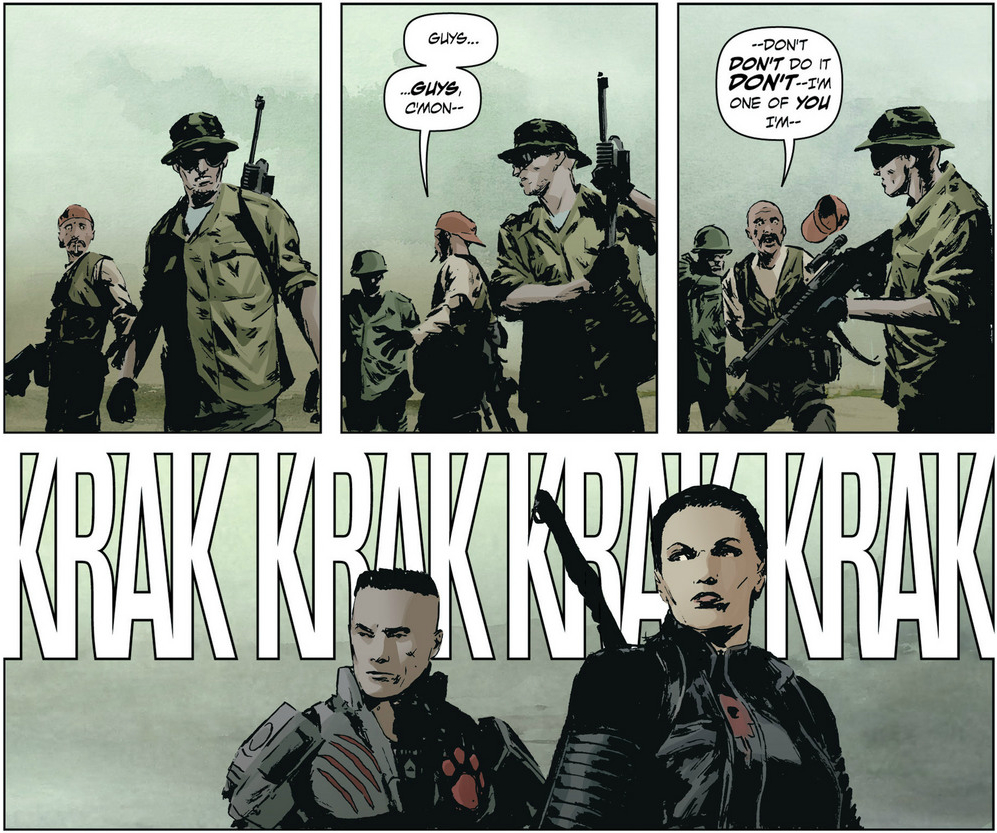 That’s cold. Greg Rucka recently teased this issue by revealing the insignia of the “Dagger” team that accompanies Forever here. Their motto — geldius in aeternum — appropriately translates to “cold forever.”