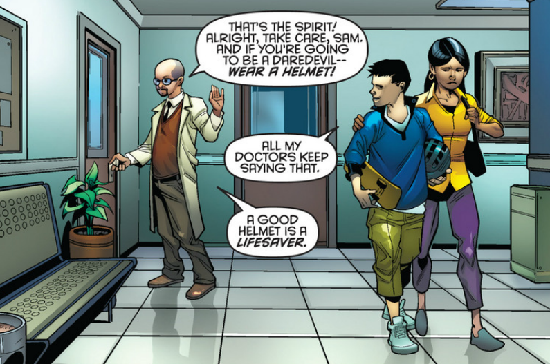 Ethan, I’m happy to consider this a new lease my my affections for this series, but I expected no less from Deadpool scribe Gerry Duggan. How are you feeling about a more-grounded Sam? Do you miss any of the outlandish cliches that Loeb introduced in issue 1? Or are you just happy to see Sam is still skateboarding? (You punk kids, you’re always skateboarding!)