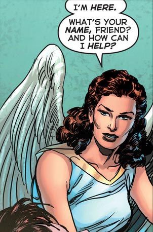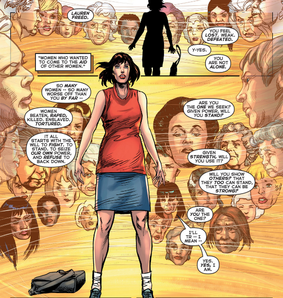 “The View From Above” aches and yearns and wants to say grand things about the human condition — in particular, what it means to be a powerful woman. Yet Kurt Busiek’s choices at characterization betray these noble intentions. Typically I’m a fan of giving characters as much of a personal, human core to their plot functions as possible, but here, to introduce Winged Victory’s origin story as stemming from a bad break-up feels oversimplified and hackneyed at best, and socially regressive at worst. In a similar vein, when she sees the Council of Nike, her pool of strong women powering her, it’s somewhat troubling to see John Roshell and Jimmy Betancourt decide to give the verb “raped” a bolder typeset when listing the atrocious things men have perpetrated. Both of these choices posit Winged Victory as being a reactive rather than proactive character; while on some level it’s fundamentally true that feminism and the self-empowerment of women comes from the horrible way they’re treated by men, these narrative and aesthetic choices seem to give more power to the men who “make” these women what they are, rather than showing women who “decide” what they are.