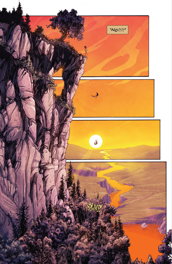 The team presses on for La Charette (a fort Lewis and Clark really did visit in late May of 1804), arriving just in time to see a mysterious girl jump to her death from the nearby cliffs — an action the artistic team of Mattew Roberts and Owen Gieni capture with stunning beauty.