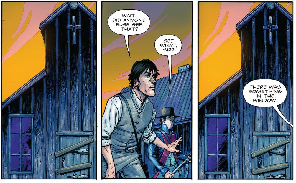 As much as I love Robert Matthews’ artwork, we can probably credit colorist Owen Gieni with much of the issue’s stunning panels. Drew featured that cliff-dive, which is made all the more beautiful by Gieni’s long, warm sunset, which reflects perfectly in the water. It might be kind of a cheat when they show us the same sunset a few hours later at the Fort, but it’s effective then too. This time super-effectively playing off the cool blues of the abandoned buildings.