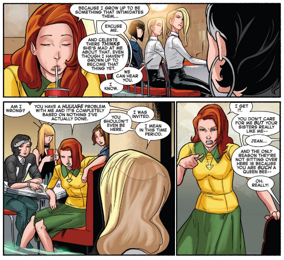 The tension between the characters is created by some long-standing storylines that have gone unaddressed for some time now. Chief among these is the animosity that exists between the Stepford Sisters and Jean Grey. There’s a simmering feud that’s existed between these two parties for awhile now and in the Battle of the Atom event the two even exchanged some psychic battle blows. It’s no wonder then that they have some unresolved issues.