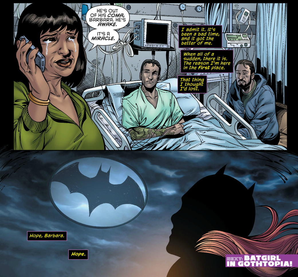 As far as I’m concerned, though, the hope reignited in that panel doesn’t just come from Ricky’s survival; it comes from the chance for Barbara to create a new family. Barbara’s actual family is rockier than ever; her brother’s been a lost cause for years, her mother has abandoned the family yet again, and her relationship with her father is complicated to say the least. Her relationship with the rest of the Bat-Family isn’t much better; she isn’t very close to Tim or Jason, Nightwing’s off to Chicago, Damian’s dead, and she and Bruce haven’t really been on speaking terms ever since the Joker’s attack. Where is she supposed to turn for support?