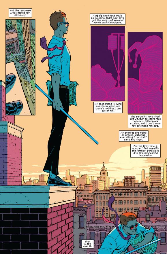 First of all: holy cow – that a beautiful page. But all he has to do to “get over it” is take in his city. And then, once he puts his plans into action, he lets slip an “I love this city.” He’s dismissing Kirsten’s offer for directions, but he reveals his true feelings in that moment. It’s not just a city that’s easy for him or familiar (or, y’know, something he can navigate with radar sense), it’s something he loves.