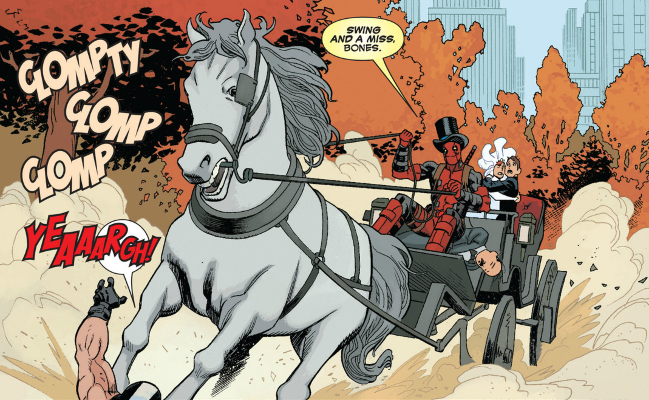 There’s so much in this panel to consider. The horrified newlyweds. The somehow-incapacitated driver (whose hat Wade is now wearing). The beautiful autumn-in-Central-Park backdrop. And just enough of Crossbones at the bottom of the panel to know he’s being trampled. No one of these elements is especially funny on its own, but they come together to make a truly great image. Duggan and Posehn get plenty of praise for their witty one-liners and references, but it takes an artist with an equally great sense of humor to bring a panel like this to life.