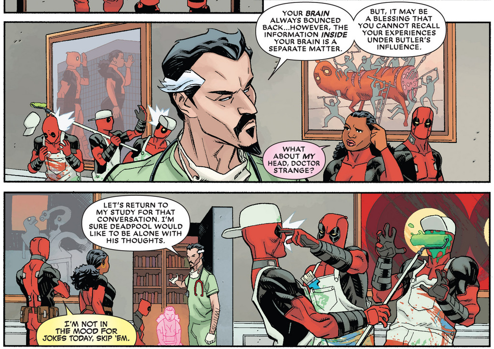 Doctor Strange has examined Deadpool’s mind and come to the conclusion that Wade now has “the mind of a Phish follower.” Things aren’t much more hopeful for Agent Preston; while Strange has many methods to free her soul from Wade’s head, there’s little he can do to resurrect her body. Fortunately, her friend Agent Adsit is on the case, but he runs into a snag when he commissions a Life Model Decoy in Preston’s likeness; turns out somebody already made one! S.H.I.E.L.D. Agent Gorman’s been using her to traffic drugs and weapons (and rake leaves), but when Adsit tips him off that Preston’s still alive, he puts out a 10 million dollar hit on Wade’s head. Deadpool survives an assassination attempt from Crossbones, but then encounters Preston’s LMD; meanwhile, it turns out that Adsit is simply bait that Agent Phil Coulson hopes to use to capture Gorman himself.