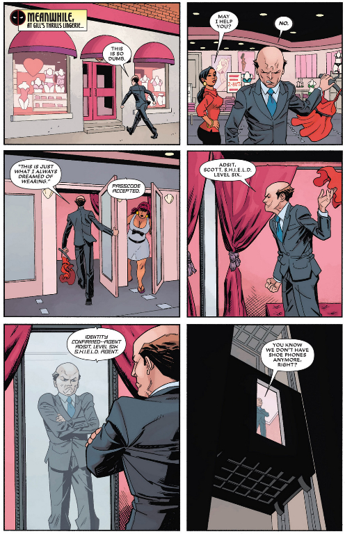When we met Agent Adsit a few issues back, did we articulate that it looked like he was Scott Adsit (of 30 Rock fame)? They use his first name in this issue and, sure enough, it’s Scott. So the obvious question becomes: is there no 30 Rock in the Marvel Universe? (Or if there is, is there no Pete Hornberger on Marvel’s 30 Rock?) OR OR OR, his Adsit a S.H.I.E.L.D. agent during the day and a comedian at night?
