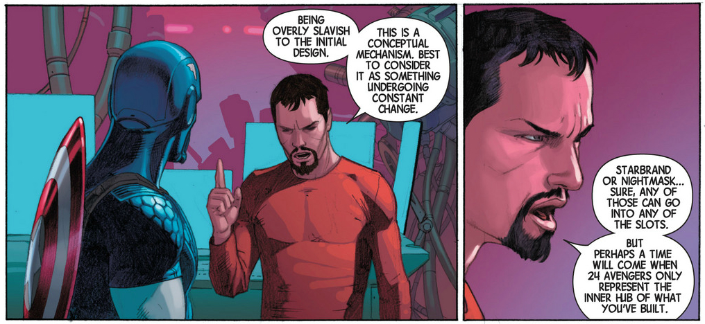 The only problem is that Tony goes on to suggest that how the machine is filled or how it operates doesn’t matter, so long as it’s there. I don’t know about you, but that sounds like a boring-ass pitch for a comic. “I don’t know. Some heroes. Who cares who they are? And they’re a team because they have to be.”