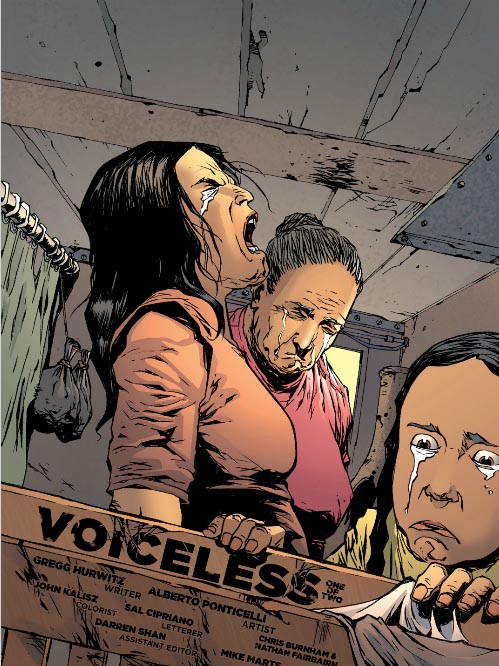 Shelby: Whenever I think of a “silent episode” of something, my first thought is the Buffy the Vampire Slayer episode Hush from season 4. The Gentlemen come to Sunnydale and steal everyone’s voices, then proceed to cut people’s hearts out and no one can scream. It’s delightfully scary. Anyway, even as a dumbass high schooler, I was really impressed by that episode, and not just because it scared the bejesus out of me. I was impressed by how much the actors could convey without dialogue, by how much tension could be built in the silence. Silent comics can do the same, can show the same range and build the same tension, and that’s what Greg Hurwitz and Alberto Ponticelli give us in this issue appropriately titled, “Voiceless.”