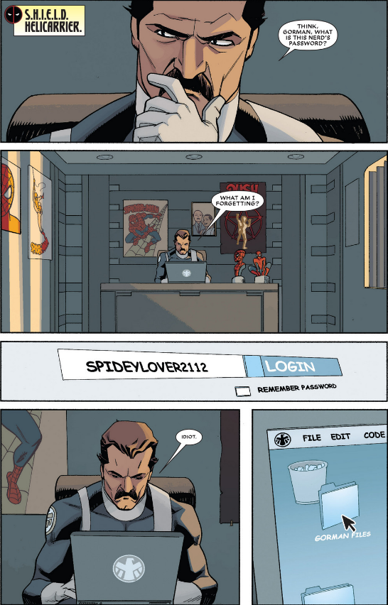 Without taking a moment to drink the entire panel in, Gorman’s answer to “What am I forgetting?” may seem like a non sequitur at best, or a pointless moment of false tension at worse. It’s easy enough to notice all the Spider-Man stuff around in the second panel, making “spideylover” an understandable choice, but what’s with that weird number dashed off at the end? If you look at the poster partially obscured by Gorman’s speech bubble, you’ll notice it’s for Canadian intellectual rock royalty Rush, and what was the name of one of their biggest albums again? That’s right, 2112. A brilliantly subtle yet immediately understood visual gag, courtesy of Hawthorne.