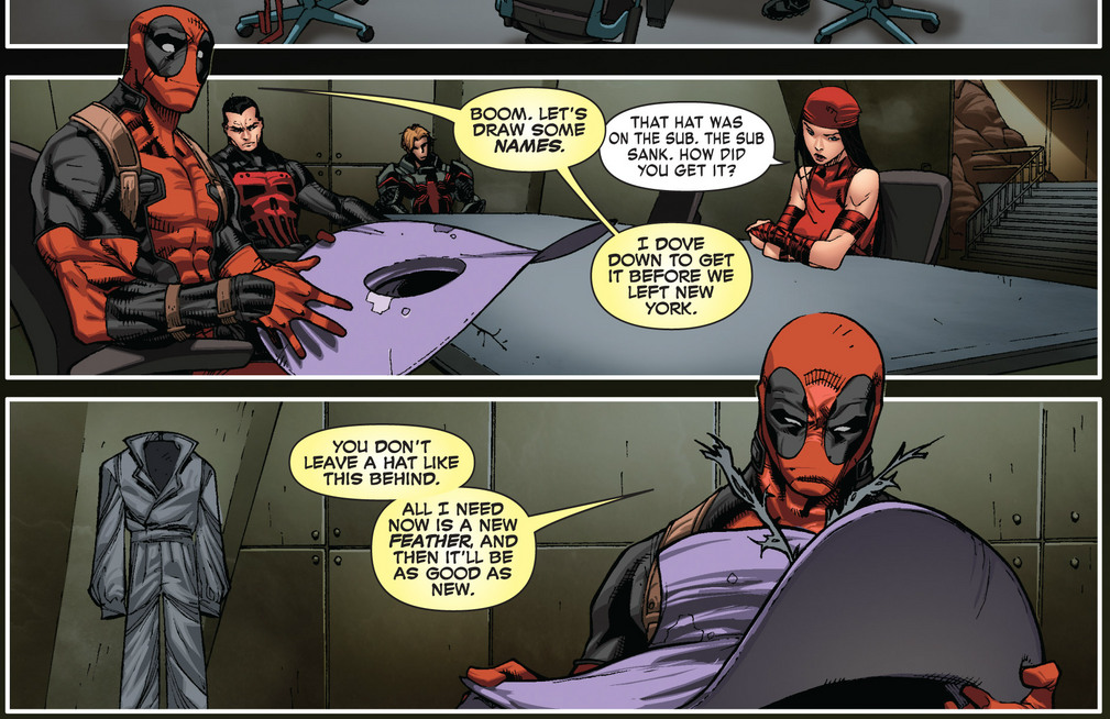 First, we get his signature childlike goofiness via his excitement about drawing names out of a hat. He’s easily amused, and he enjoys the little rituals like this one in the same way that young children love snack time and nap time. In fact, I imagine that Wade STILL religiously observes both snack time and nap time, if off-screen. Second, I’m glad to see that Barberi falls into the camp of artists that choose to show Wade’s giant smiles and frowns through his mask – some of that cartoony vibe you mentioned, Patrick. Yes, it makes him look a bit like a Ninja Turtle, but it definitely adds to his charm. And finally, there’s the fact that he actually dove down into a sinking submarine while no one was looking, just to save the hat. ‘Nuff said.