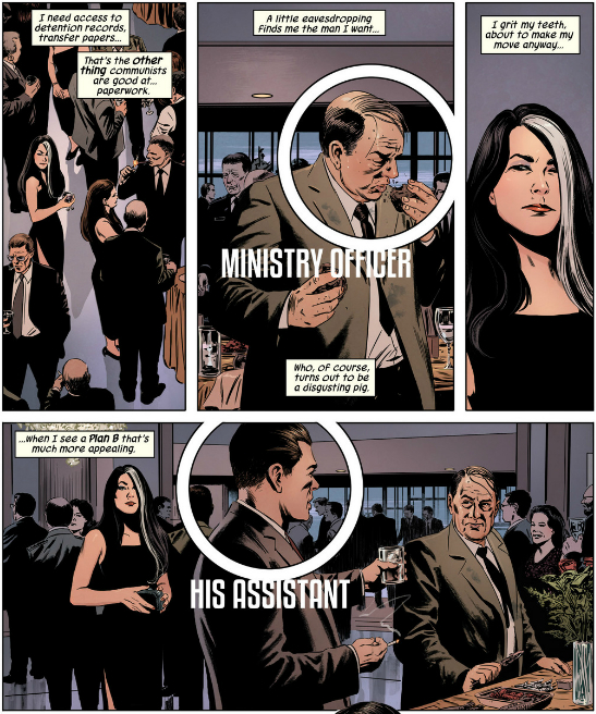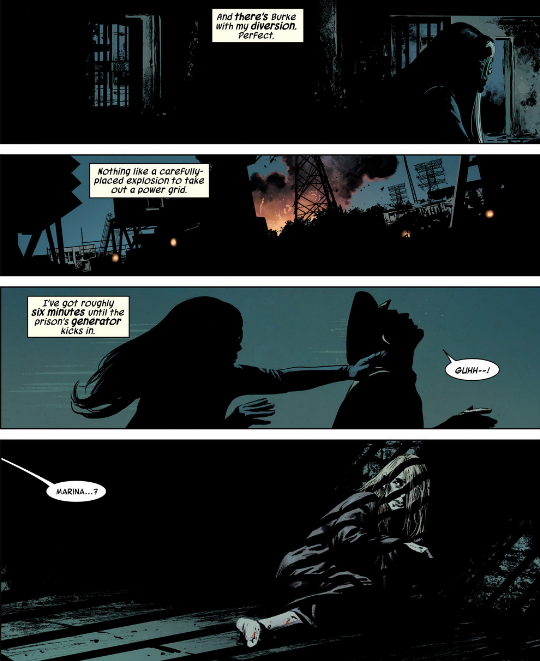 Velvet finds the target of her extraction mission: Marina, lying in a dank jail cell. She begins to introduce herself as a friend of… then, brilliantly, Velvet realizes she doesn’t have the information of X-14’s cover at hand. It requires a moment of recollection, of utterly human forgetfulness and realization, rendered brilliantly by Epting shoving a brightly colored reminder panel into the middle of the external action, and Velvet’s internal dialogue. This moment, followed immediately by Velvet’s admission to feeling rage at Marina’s abuse and pain, does so much in terms of empathizing with our hero, rather than merely admiring her from afar. Because she sometimes overlooks or forgets things in the heat of the moment, because she admits to not being a blank superhero, her actions are that much more thrilling, because we recognize traces of ourself in her. I might call this The McClane Effect.