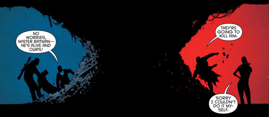 Patrick: It’s an interesting set of pages for sure. It’s like Tomasi wants to set up the parallels between Batman and Two-Face, but is focused on the Batman of right now rather than the platonic, elemental “Batman.” In that way, seeing Harvey’s uncontrollable duality literally framed by Bruce losing Damian finally answers the question of how this story is even part of the same series that arguably dwelled on Robin’s death for seven consecutive issues. I’m still not all that moved by Harvey as a character, but his more superficial qualities are starting to link up to Bats in a very real, pretty cool way. Plus, some of Gleason’s duality-obsessed drawings are super fun and effective.