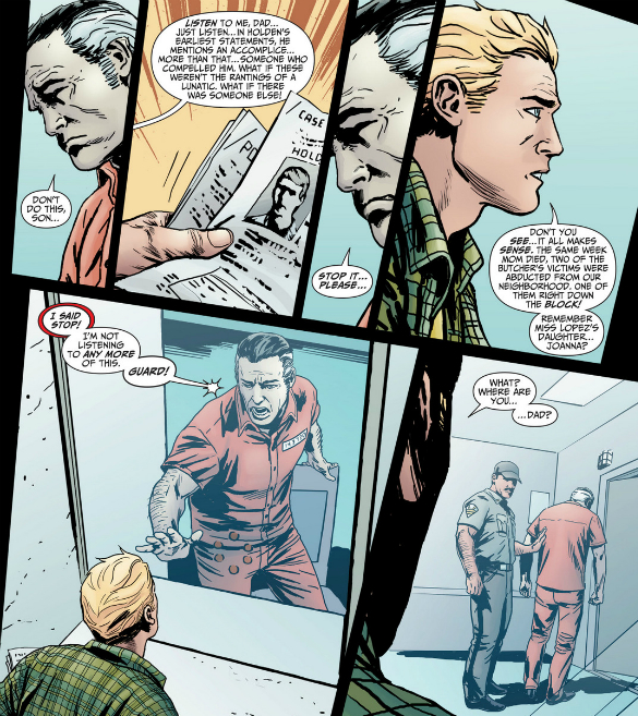Okay, maybe “candy colored” is an overstatement for a kid who was effectively orphaned when his father was arrested for killing his mother, but the point is: it looks like the truth is actually worse than Barry ever suspected. The issue opens with a straightforward jewel-theif apprehension, but in true Law and Order fashion, leads directly to the discovery of a body. Or thirty. Back in his civies, Barry is working the case with the rest of the crime scene team, but is mysteriously ordered off of it by Frye, who suggests that the bodies are the undiscovered victims of the Broome Hill Butcher, a serial killer apprehended twenty years ago. Only, it looks like many of these victims are more recent than that — and a few of them were killed around the same time and in the same neighborhood as Barry’s mother. Barry rushes to visit his father to share the news that he may be on to who actually killed Nora, only his father is just as discouraging as Frye was.