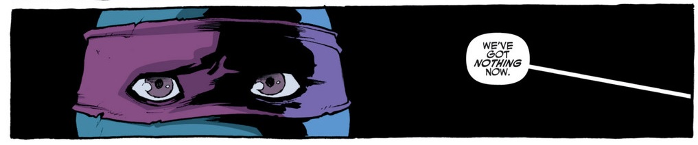 The large eyes, with their oversized irises, allow Campbell to show an amount of expression there that is rarely seen in comics. A lot of the time when close-ups on eyes occur it’s used to depict concentration or anger or some other emotions usually associated with battle. Campbell flips the tables here and uses an eye close-up to subtly show us Raphael emotional state. They say that the eyes are a window to the soul, and here we see that underneath his hard exterior Raph is just a huge softy with a lot of emotions that sometimes come out the wrong way. Also, I love comparing this portrayal of the turtles in contrast to the iris and pupil free depictions of their eyes which grace many of their previous incantations.