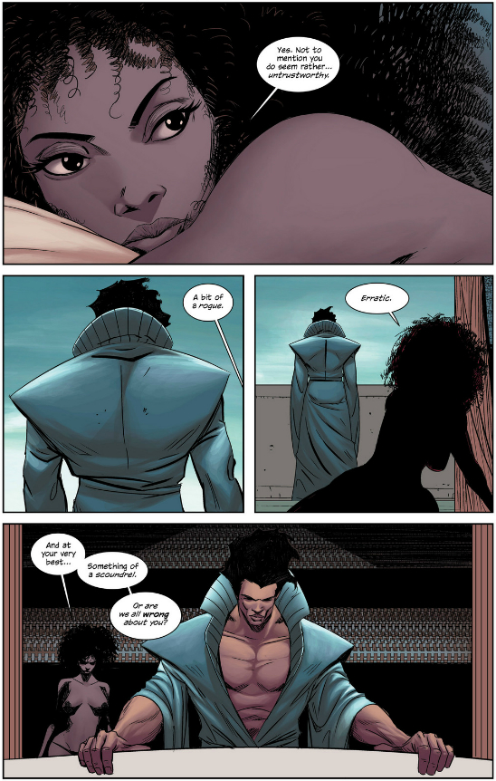 The creation of an African-American nation is obviously a long way off from history as we know it, but it’s absolutely fascinating to see how it was shaped in similar ways. Most notably, the costuming and design of the Kingdom calls to mind the pan-African stylings of 70’s funk and Blaxploitation, creating a similar sense of a people who are African in spirit, if not necessarily by birth. That’s a tricky subject to parse even in the real world, so I won’t aim to analyze the psychology of the Kingdom, but I do think it’s interesting that they are the richest nation in East of West. Indeed, the correlation between socio-economic status and race seems to be flipped in the world of the Seven Nations. How exactly that played out in their history is the stickiest subject of all, but Hickman does make some hypocrisies patently clear.