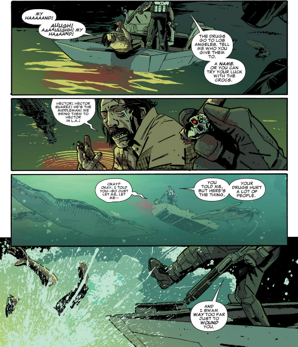 This probably isn’t fair, but I can’t help but to compare this issue to the recent first issue of Edmondson’s other new title, Black Widow (and no, it’s not just because — SPOILER ALERT — both titles feature the protagonist feeding someone to an alligator, though that is an impressive display of synergy). Both titles hit the same prerequisite first issue beats, and Widow’s mission in that first issue is just as simple and flawlessly executed as Punisher’s, but somehow there’s more depth with her. Both characters’ internal monologues spend a lot of time explaining their methods, but Natasha’s also hints at dark secrets and hidden pain, while Punisher tells you everything you could ever really know about him on that one page I posted. Likewise, Frank’s plan is remarkably straight-forward and goes off without a hitch; so does Natasha’s, but at least Edmondson throws a few curveballs into what her mission actually is, while Frank’s never evolves beyond blowing up some faceless drug pushers.