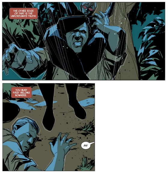 Patrick: Taylor, you got my favorite Noto-ism with that sketch-kick panel. It’s astounding that the guy works in such muted colors and soft edges, but still manages to be a fantastic visual storyteller. Basically everything around Natasha’s realization that she’s just rescued a monster is damn near perfect, from the stark cutaway to el Lobo Blanco splattered with blood, to the wide full-page splash of Widow and Lobo bailing on the chopper. But the best is this quick sequence where they hit the water — Lobo tumbling in face first like a jackass and Widow gracefully sliding in — and Noto cuts away just long enough to show us why the General is going to be proper fucked after Widow stabs him in the gut. I even love the way Widow exits the scene in the same direction as the cloud of blood escaping her victim.