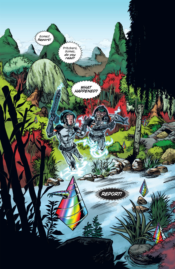 Of course, the location isn’t exactly the most exciting part of that closing image — look at those weird, rainbow-colored tops! Are they the aliens, or just goofy, awkward-looking droids? I have no idea, but I think they might be the “living rainbow” Willett saw on the hull back in issue 2. The prospect of legitimate alien contact — a close encounter of the third kind, if you will — has me very excited for the next issue. This series has been fantastic with doling out questions, but I might be ready for an answer or two.