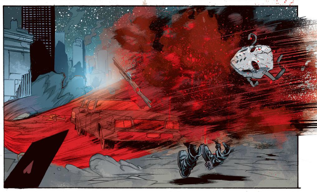 First of all, what an awesome close-up on the character’s face. We’re forced to process these images at the same time — not only is it hard to isolate your gaze on the page, but everything draws attention to the second panel. Notice how the top of Ace’s head invades the panel before it, or how the strokey background that starts on the right side of the first panel is continued on either side of the second. Or, go simple: there’s a goddamned shotgun going off with a loud yellow BOOM. It makes that split second tight-shot of Ace’s face that much more kinetic — however he’s making that judgement call, it’s happens ludicrously fast, and thought bleeds into action before we can really make sense of it.