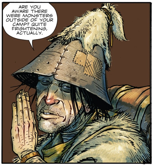 The panel above is a wonderful example of the way Roberts depicts this interesting character. In particular I love the attention to detail that Charbonneau receives in this and other panels. His eyes are shadowed by the brim of his hat which suggests a man who is both literally and figuratively shady. In addition, the tip of his nose is red and whether that is from cold or drink we are left to guess, but given the rest of his look, the former seems more likely than the latter. Also, he has that hat. It’s weird and pointy with some animal skin on it and is atypical among the hats of the Louis and Clark expedition. It seems that Charbonneau is destined to stand apart from the crowd in this story and whether that is a good or bad thing can only be known in later issues. Yet another mystery waiting to be revealed!