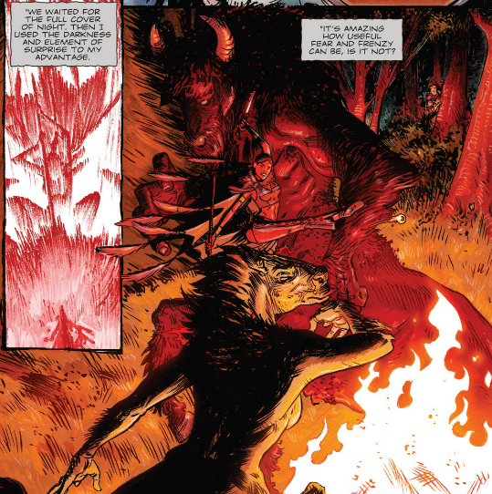 The issue opens with the men weighing their options for returning to the ship under the watch of the Minotaurs. No plan is ideal, but they decide to send a small team ahead of the main group as a diversion. Just as the first group prepares to leave, they are greeted by Toussaint Charbonneau and his wife, Sacagawea, who have already dispatched all of the monsters. Er, Sacagawea did, but Charbonneau takes all of the credit.